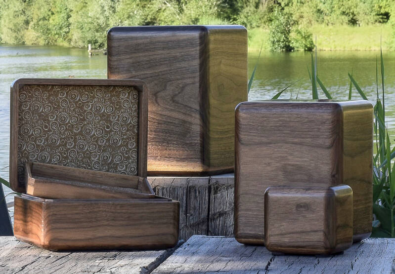 Deze urnen en herinneringskistje zijn gemaakt van notenhout.